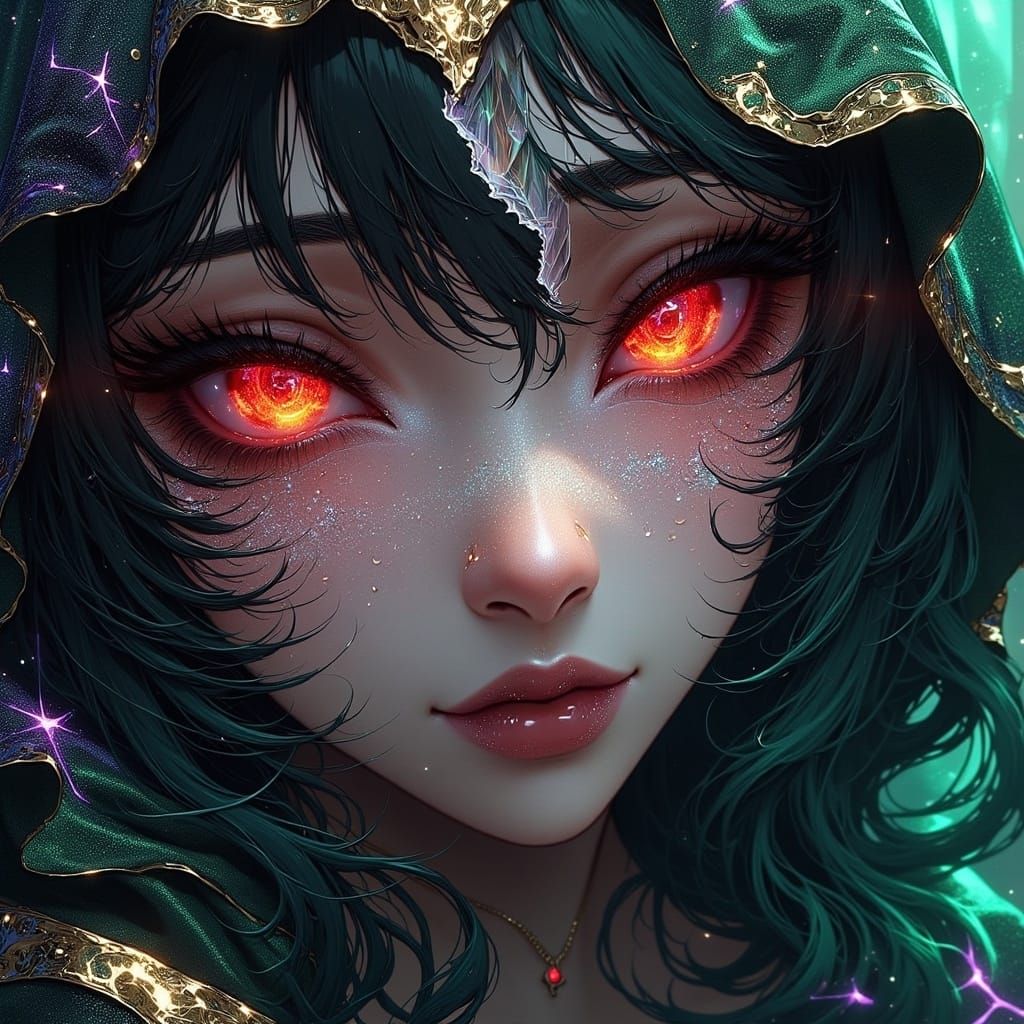 80s anime, beautiful woman struggling with her emotions and confusion, zentangle, fractured, vanta black green purple red blue siver gold Ar...