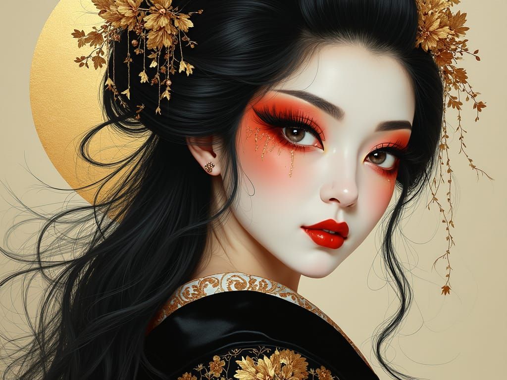This image features a stunning geisha with intricate, hand-painted makeup and a luxurious black and gold kimono, her long hair flowing in loose waves, evoking traditional Japanese elegance with modern, bold flair.