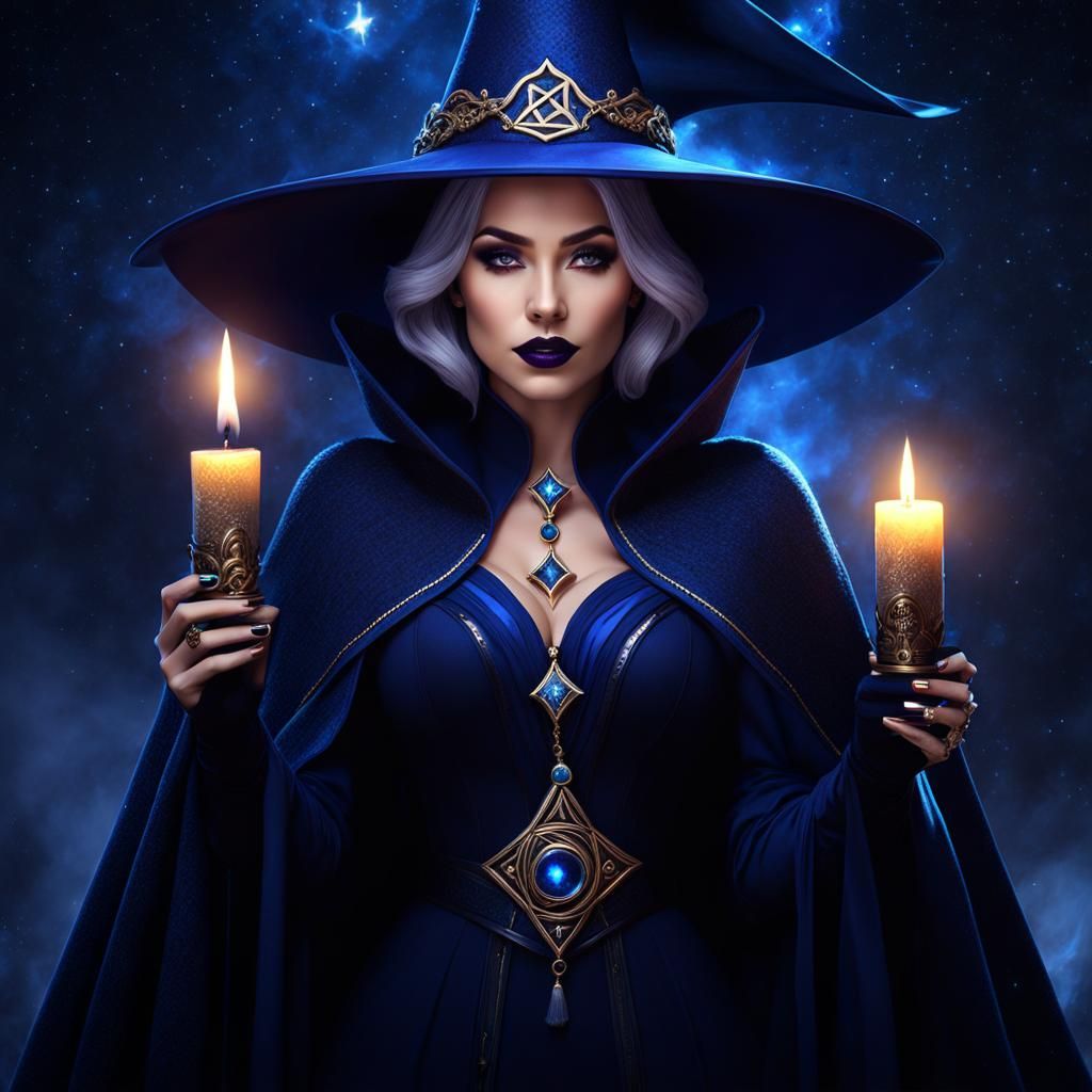 This image shows a beautiful witch with dark makeup wearing a blue cape and pointy hat. She is holding a candle and runes, with stars surrounding her, rendered with dynamic and volumetric lighting.