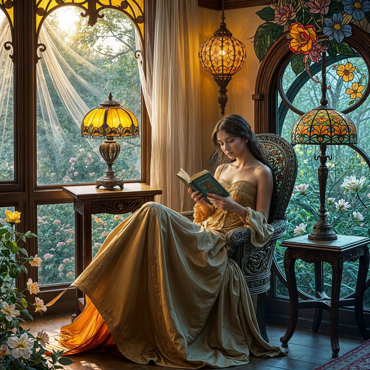 Art nouveau reading nook corner in the living room, art nouveau Tiffany lamp, cosy armchair near a art nouveau window with veil moved by the wind. Focus on a young woman in art nouveau gown is reading a book. The corner is bathed by the sun spells of the morning light. The background is a spring flowery ...