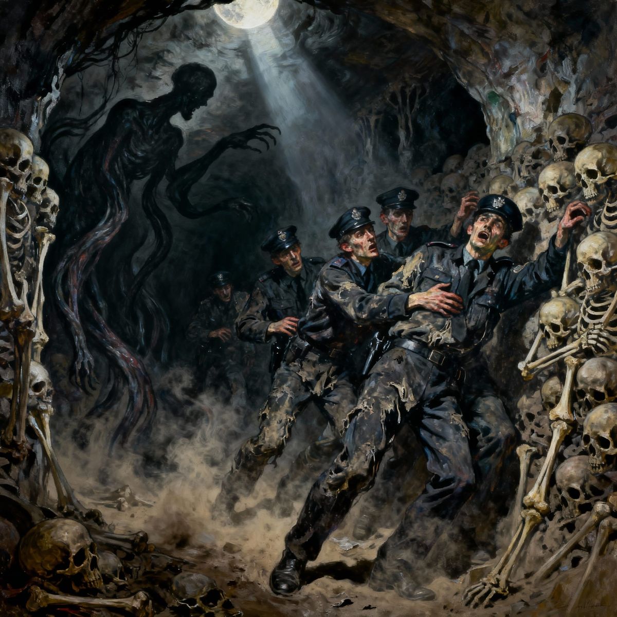 This image depicts disheveled police officers writhing in the dark, skeletal tunnels of the Paris Catacombs. Rendered with dramatic lighting and a brooding, expressionistic aesthetic.