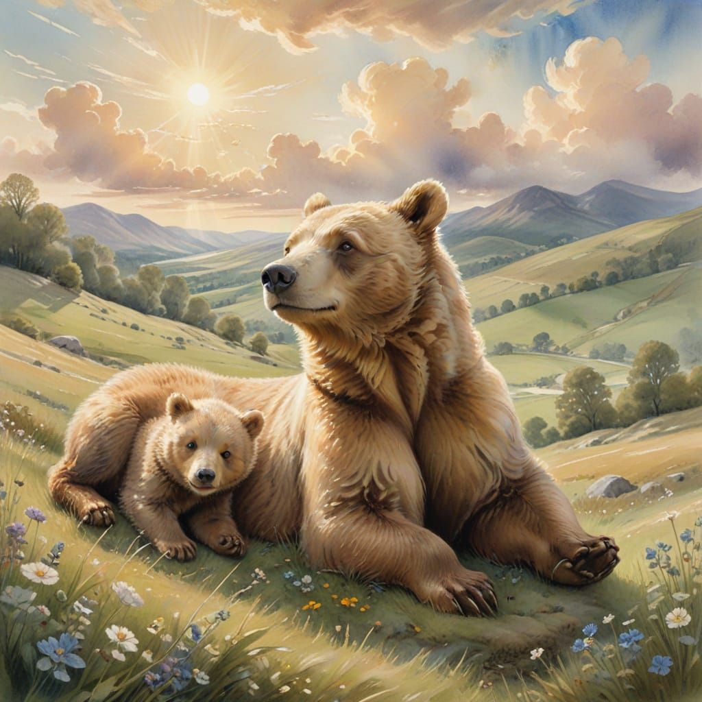 This heartwarming illustration depicts a mother bear and her cub resting in a meadow, peacefully watching the clouds. Rendered in soft watercolor tones with gentle brushstrokes, it evokes a sense of innocence and tenderness.