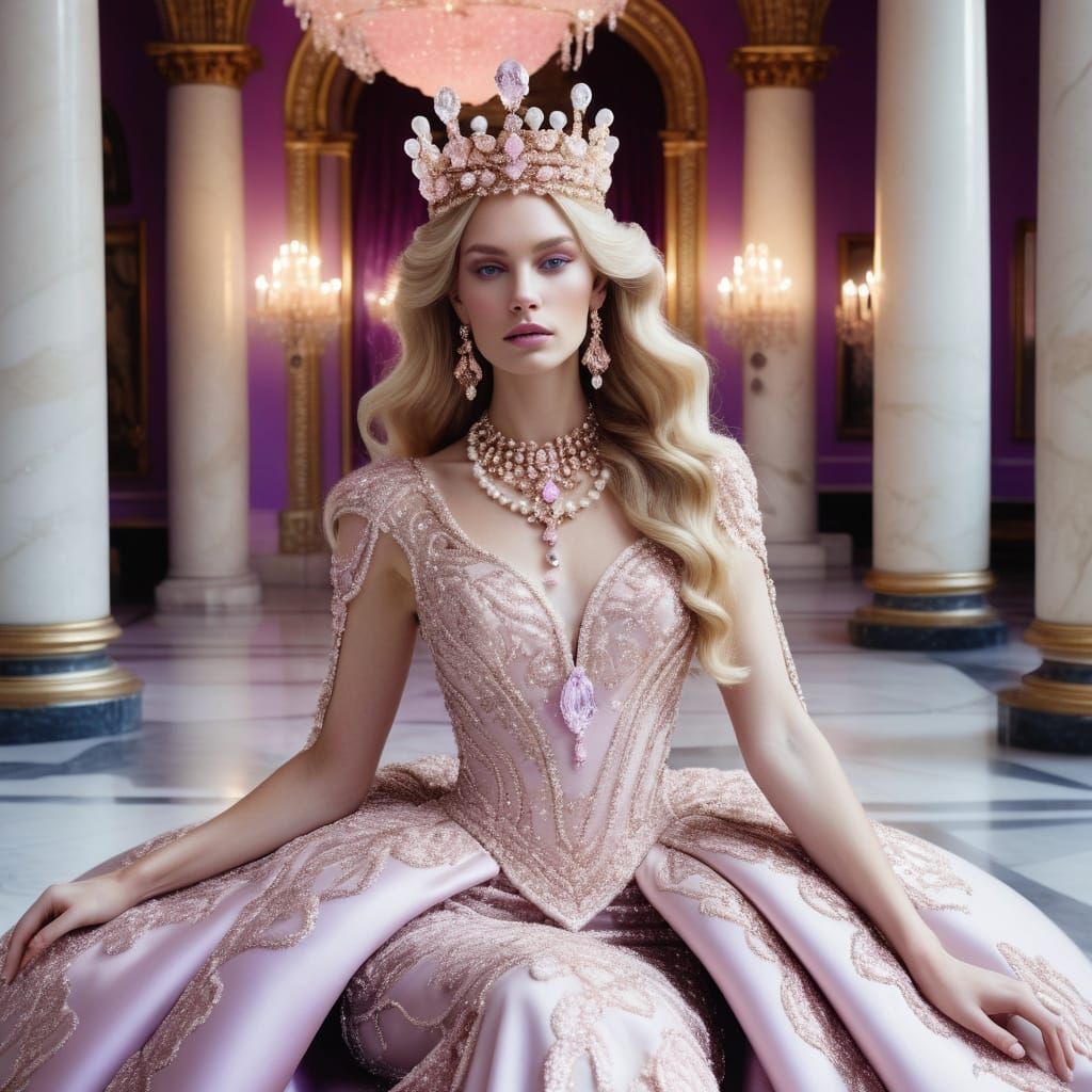A striking picture of a crystal cheetah guardian standing behind a noble woman. The woman wears a baroque gown with pearl embroidery in a luminous galactic palace. The scene has a rich high fashion fantasy aesthetic.