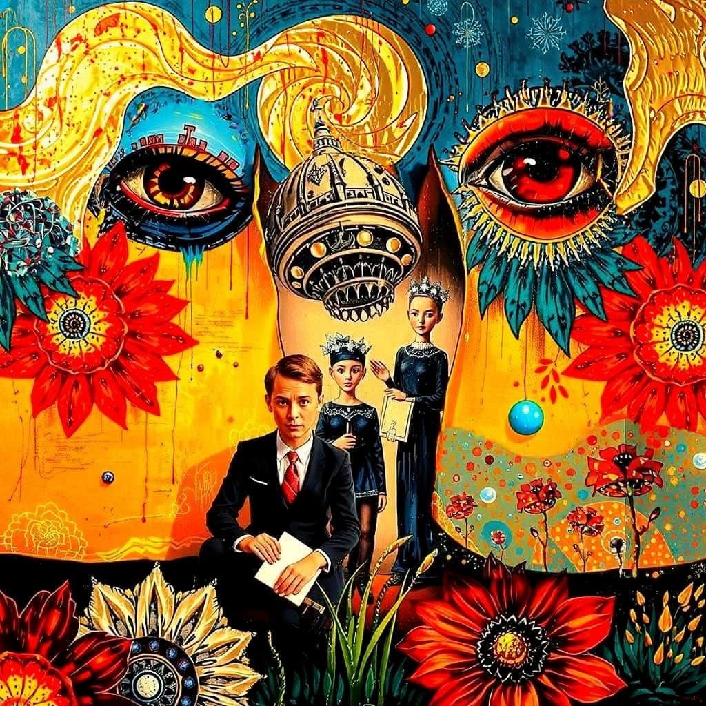 This image showcases vibrant figures amidst a fantastical landscape, blending Dada and expressionist styles with naive and fractal patterns, set against a deep blue and green background with gold accents.