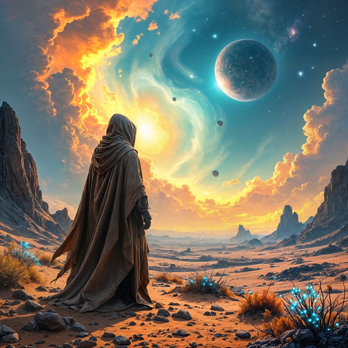 This image shows a solitary hooded figure contemplating a nebula-filled sky on an alien world. Bioluminescent plants light the craggy landscape in a hyperrealistic style with extreme contrast.