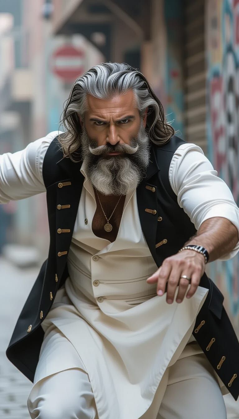 This image shows a striking black and white portrait of a man with wavy hair and a beard, captured in an action movie style. The photograph blends street and fashion photography elements, focusing on a deep, intense gaze.