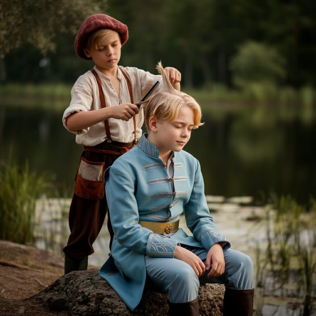 This image shows a young prince being given a haircut by a country boy, amidst a serene lakeside setting with trees in the background, beautifully lit and full of natural charm.