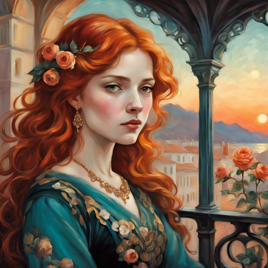 This image shows a red-haired woman in profile on a rose-framed balcony, overlooking the sunset. The art nouveau portrait features golden patterns and expressive brushstrokes.