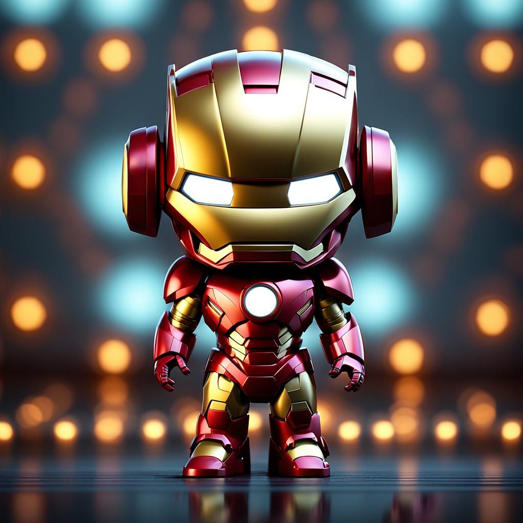 A 3D rendered caricature of Iron Man on a stage in profile. The image is kawaii style with a metallic Victorian fashion aesthetic reminiscent of a children's watercolor storybook.