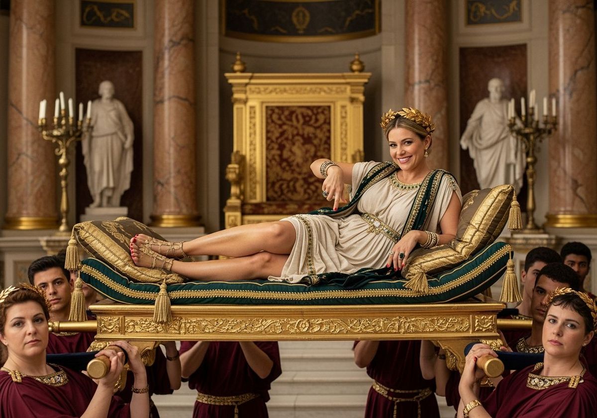 This image shows a Roman Empress relaxing on a golden litter carried by servants in a throne room. The scene evokes professional portraiture with natural lighting and shallow depth of field.