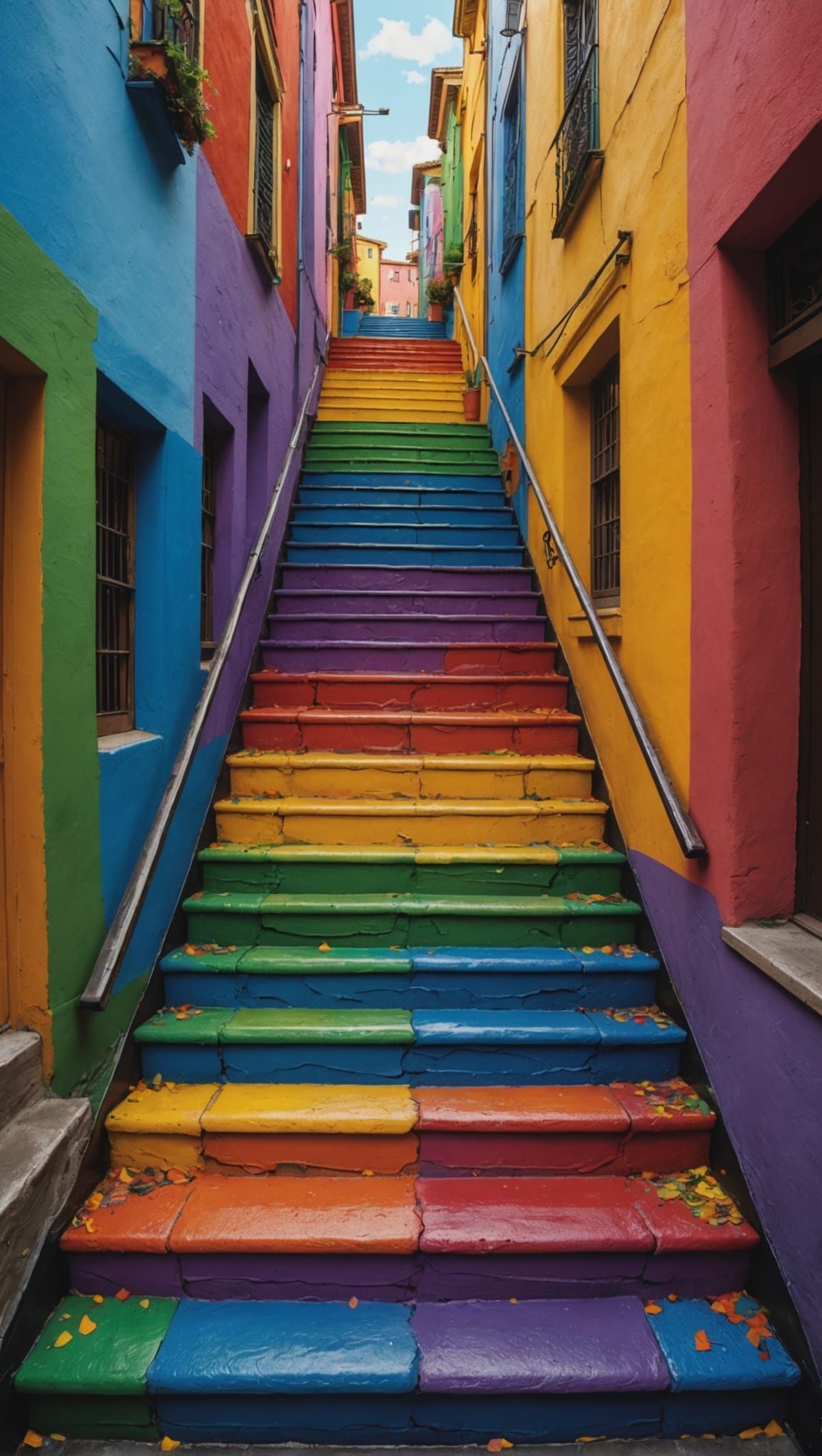 A hyperrealistic image of rainbow colored Escher steps. The artwork is a colorful splash art concept, intricately detailed with side lighting and a vibrant background.