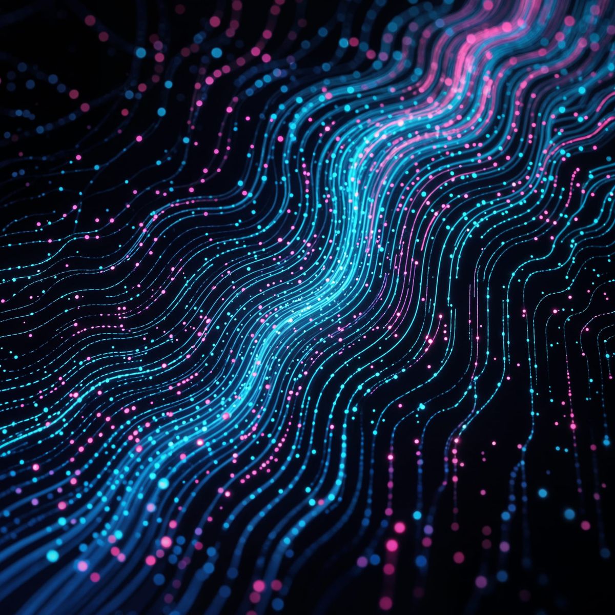 This abstract artwork features a vibrant cascade of cyan and magenta liquid resembling data streams against a dark background, evoking an energetic flow-state.
