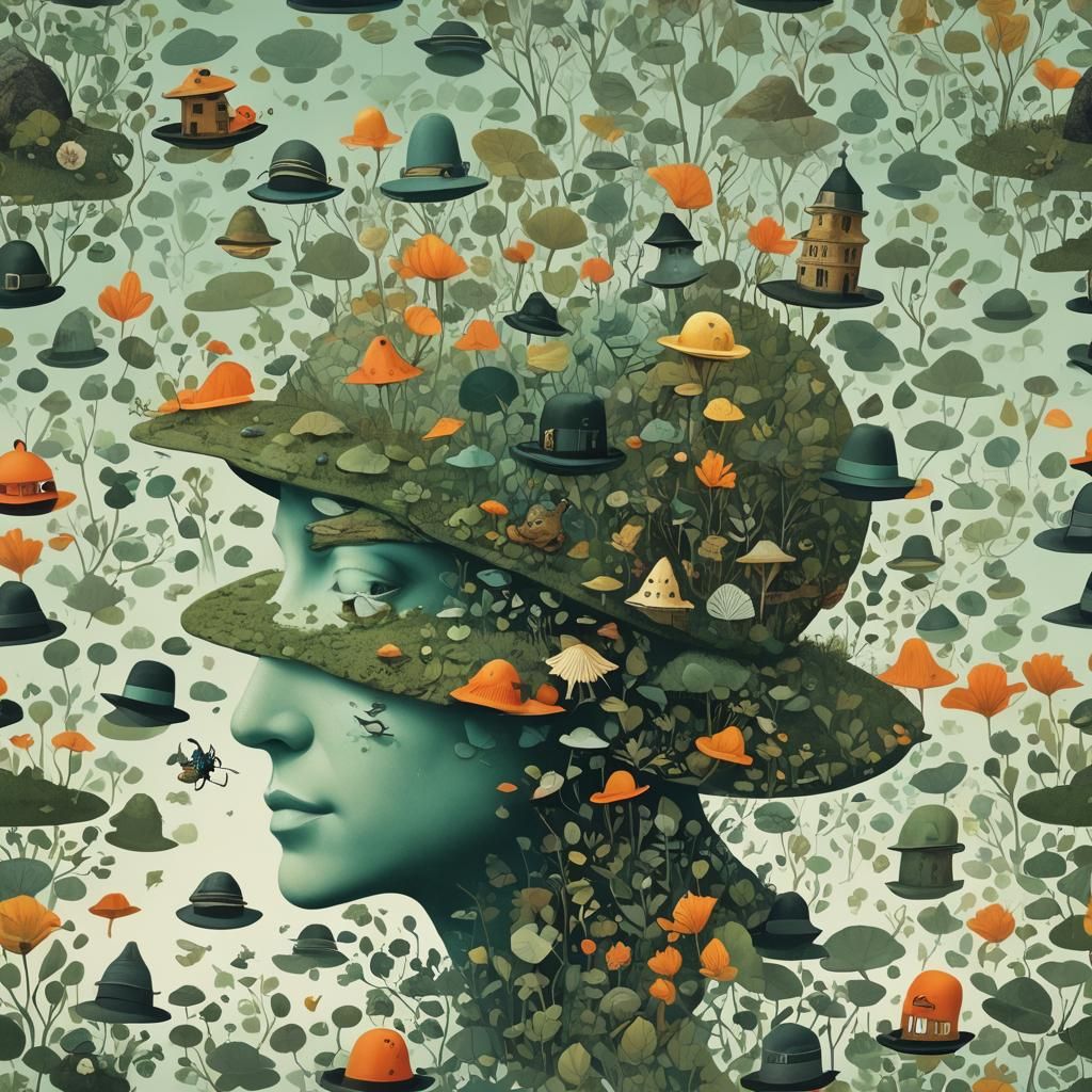 This image shows a surreal landscape inside a man's head, featuring frogs in hats and flying cars. The artwork blends illusionary and cubist elements with vibrant, contrasting colors.