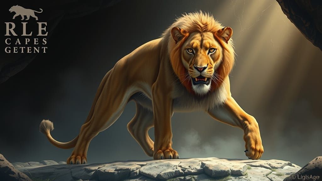 A striking picture of a golden-brown cave lioness poised to hunt in an Ice Age landscape. The artwork is rendered with cinematic lighting and highly detailed textures.