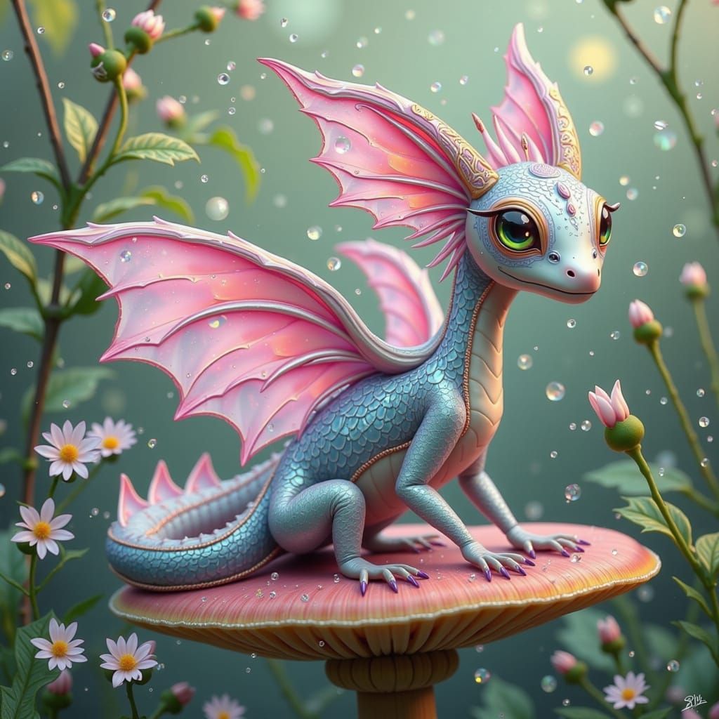 This enchanting image depicts a delicate rose-dragon fae perched on a toadstool, surrounded by lush greenery, with iridescent scales blending into rose petals and tiny claws and wings sprouting from its back, in a whimsical faerie art style reminiscent of Arthur Rackham and Brian Froud
