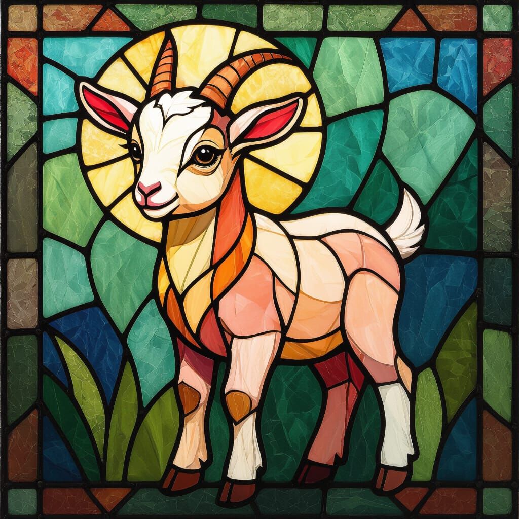 This image shows a baby goat crafted in a colorful stained glass effect, featuring panes of teal, peach, brown, green, and blue. Thick black lines define its form, with soft light creating a gentle glow.