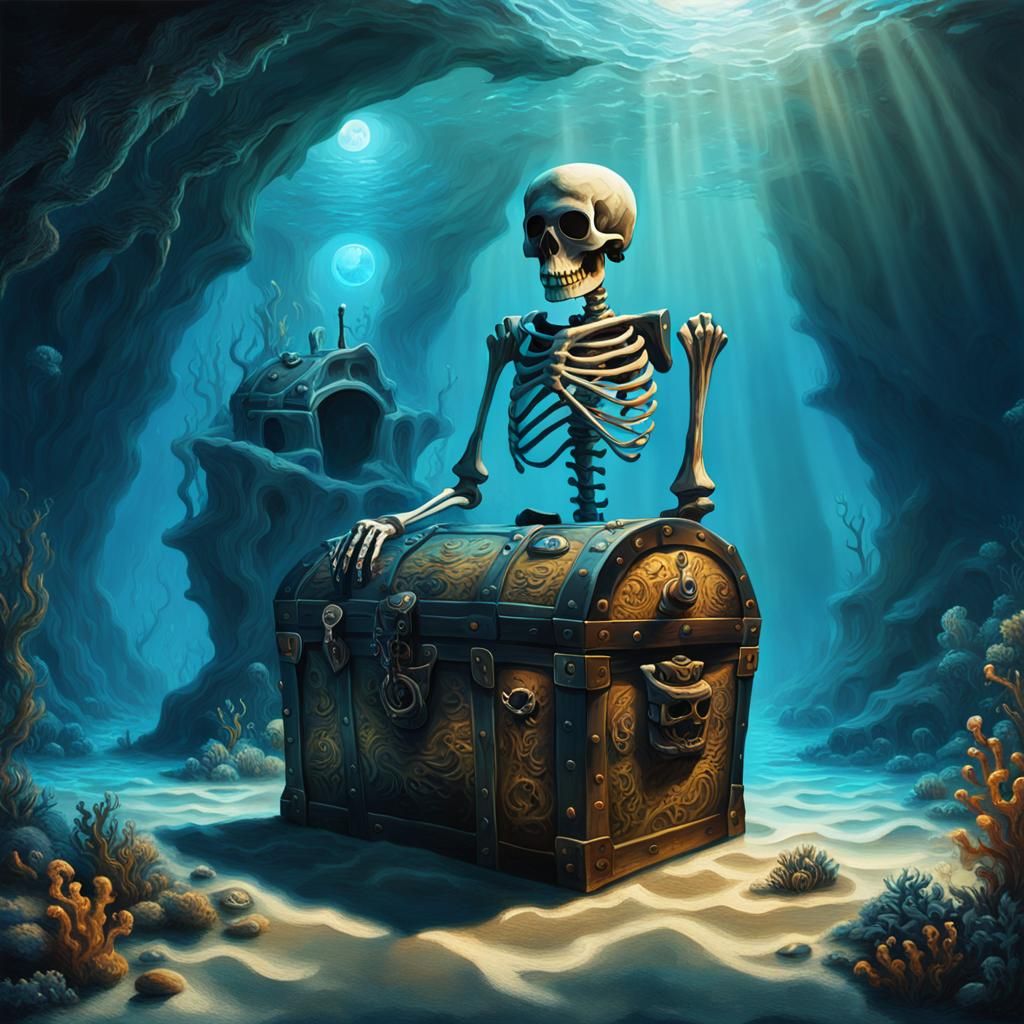A vibrant surrealist image of a pirate skeleton guarding treasure near an underwater cave. The scene is bathed in soft, filtered sunlight with shimmering iridescent colors, rendered as an oil painting.