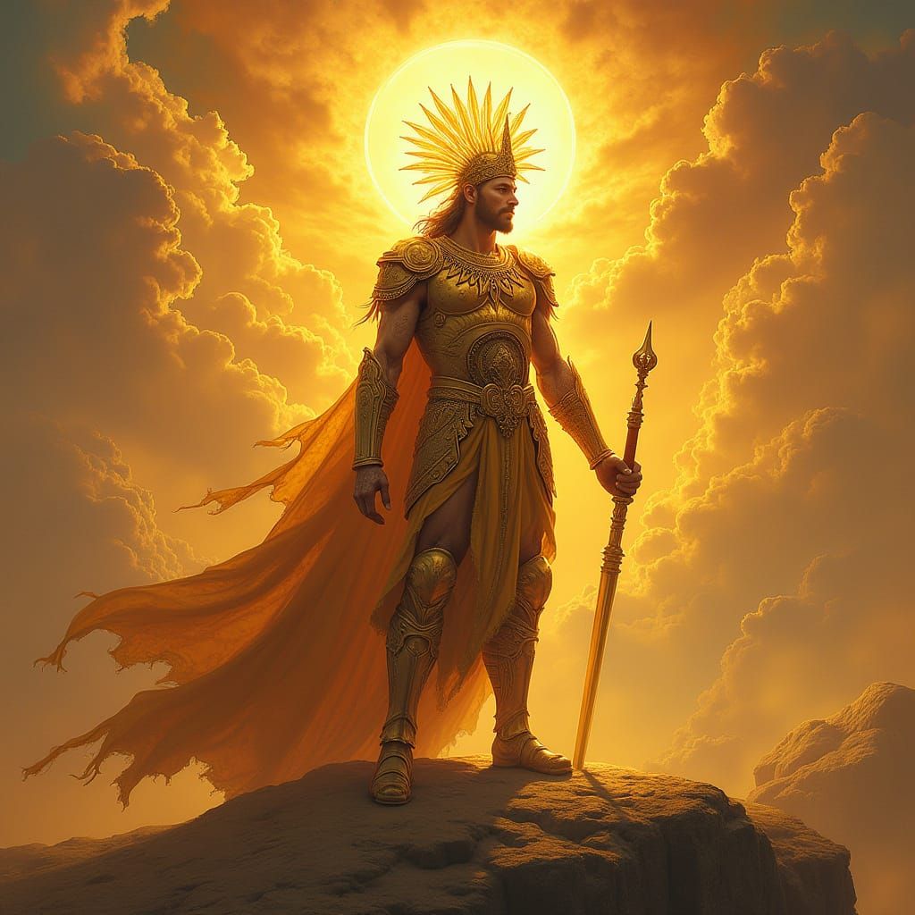 This image depicts a stunning male god of light and sun from Persian mythology, clad in ornate armor and a radiant crown, surrounded by warm, golden light, in a style reminiscent of fantastical landscapes and detailed artwork
