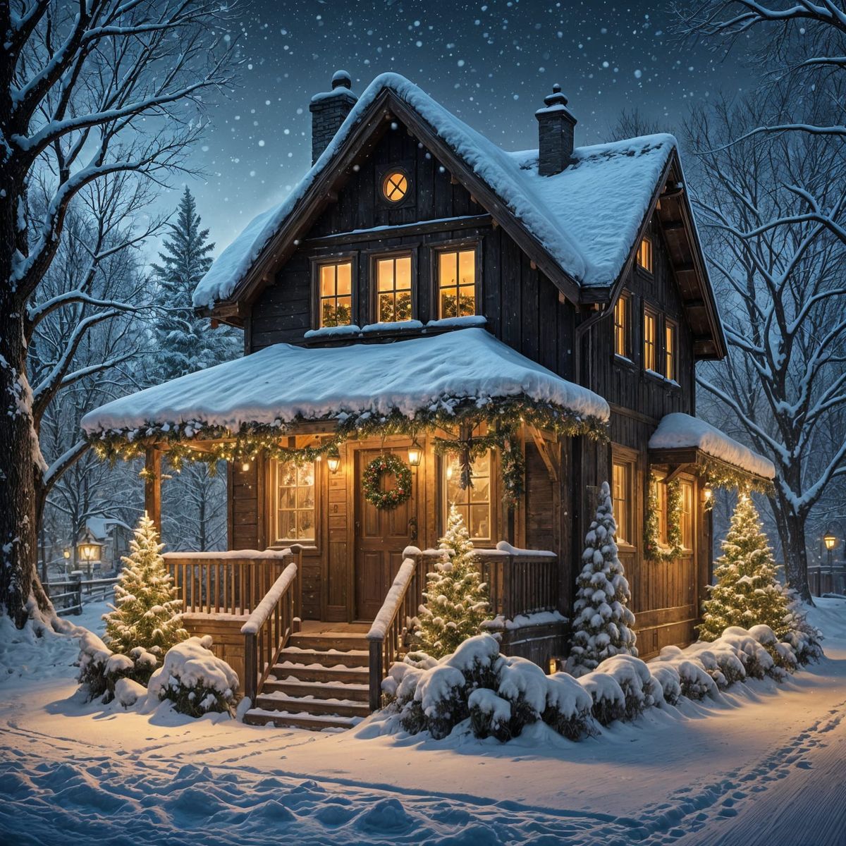 This image shows a charming house adorned with festive Christmas lights and a welcoming wreath on the door, set against a snowy landscape.