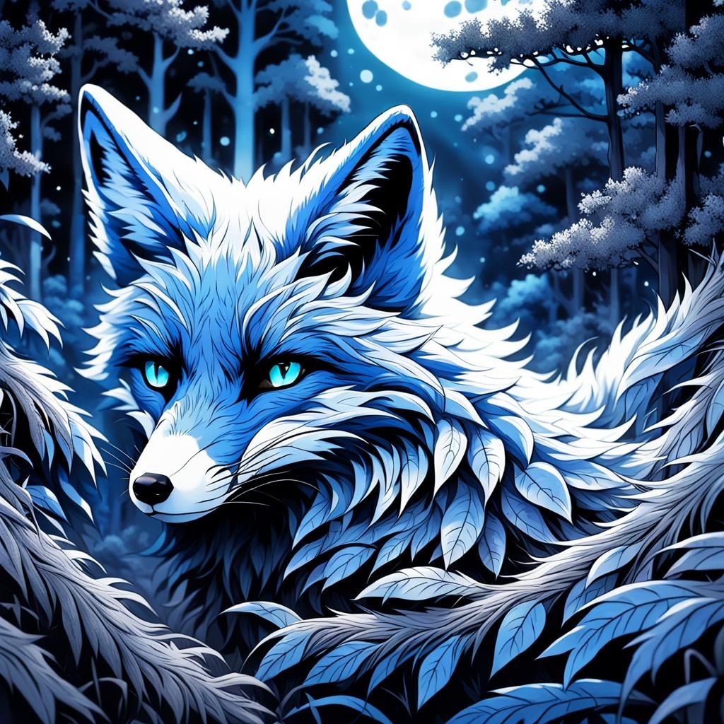 A striking picture of a black and white fox stealthily moving through forest undergrowth. The animal is rendered in a highly-detailed anime style with soft fur and intense eyes, set in a misty, eerie forest environment.