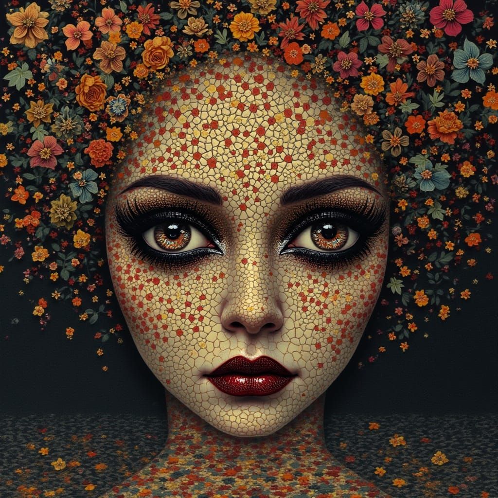 This image shows a futuristic couture design with jagged, fractured elements and special eyes. The composition features patterned reflections, symbolic dreams, and neuromorphic abstract holograms in a 3D collage with dramatic lighting.