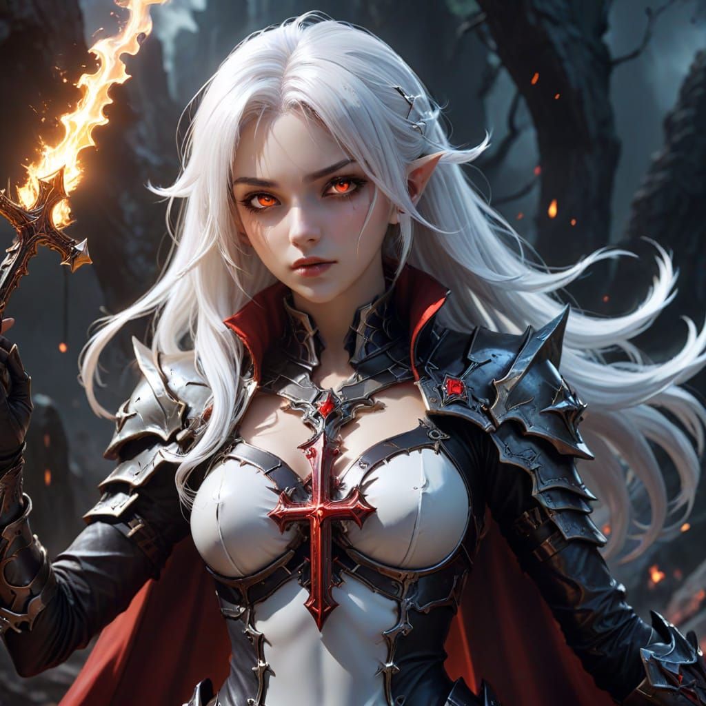 This anime-style image depicts a female vampire mage in a demon valley, casting a holy cross spell. Features flowing white hair and glowing magical symbols on armor.