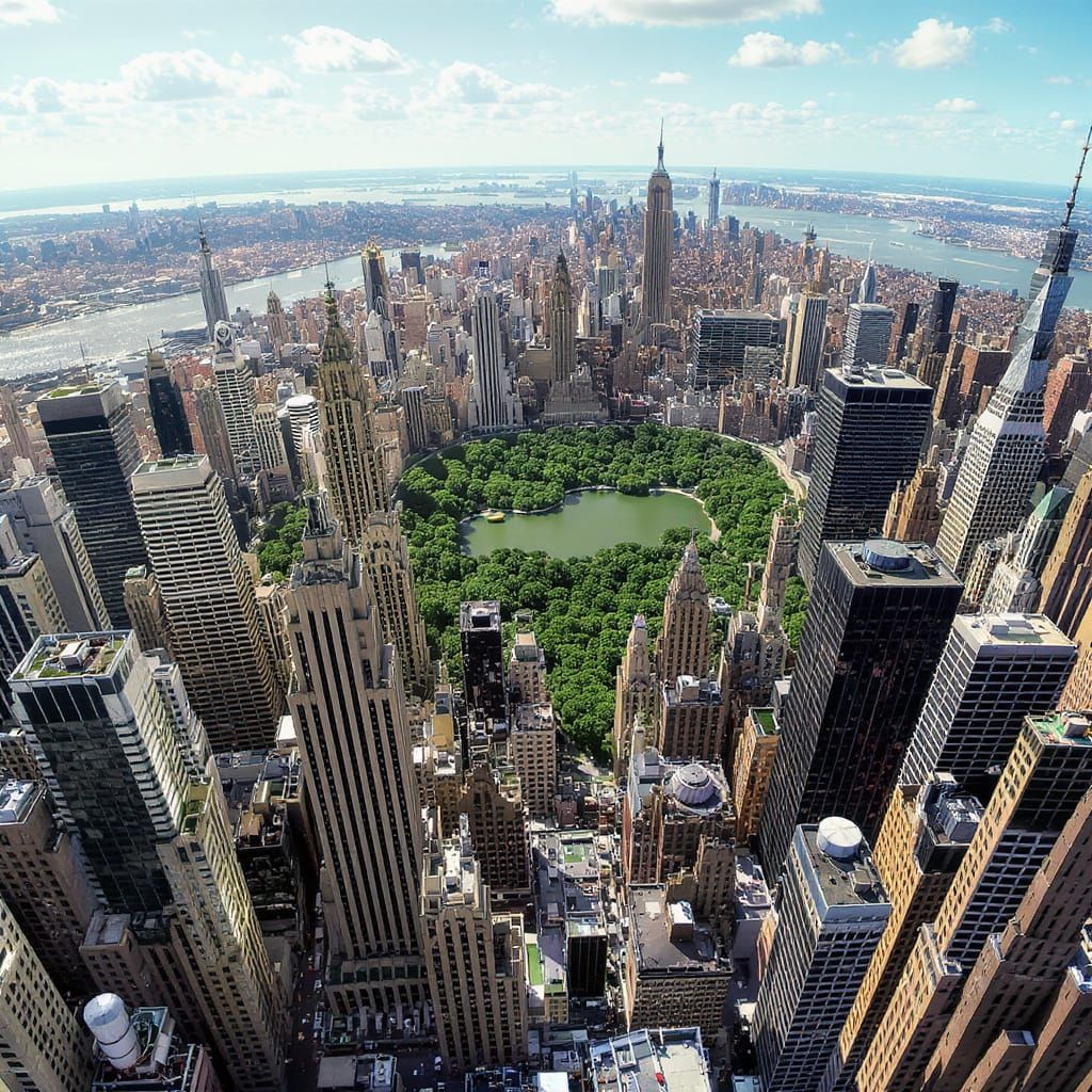 A stunning aerial view of New York City featuring towering skyscrapers and a vibrant Central Park. The cityscape is depicted with rooftop gardens and water towers, in a futuristic aesthetic.
