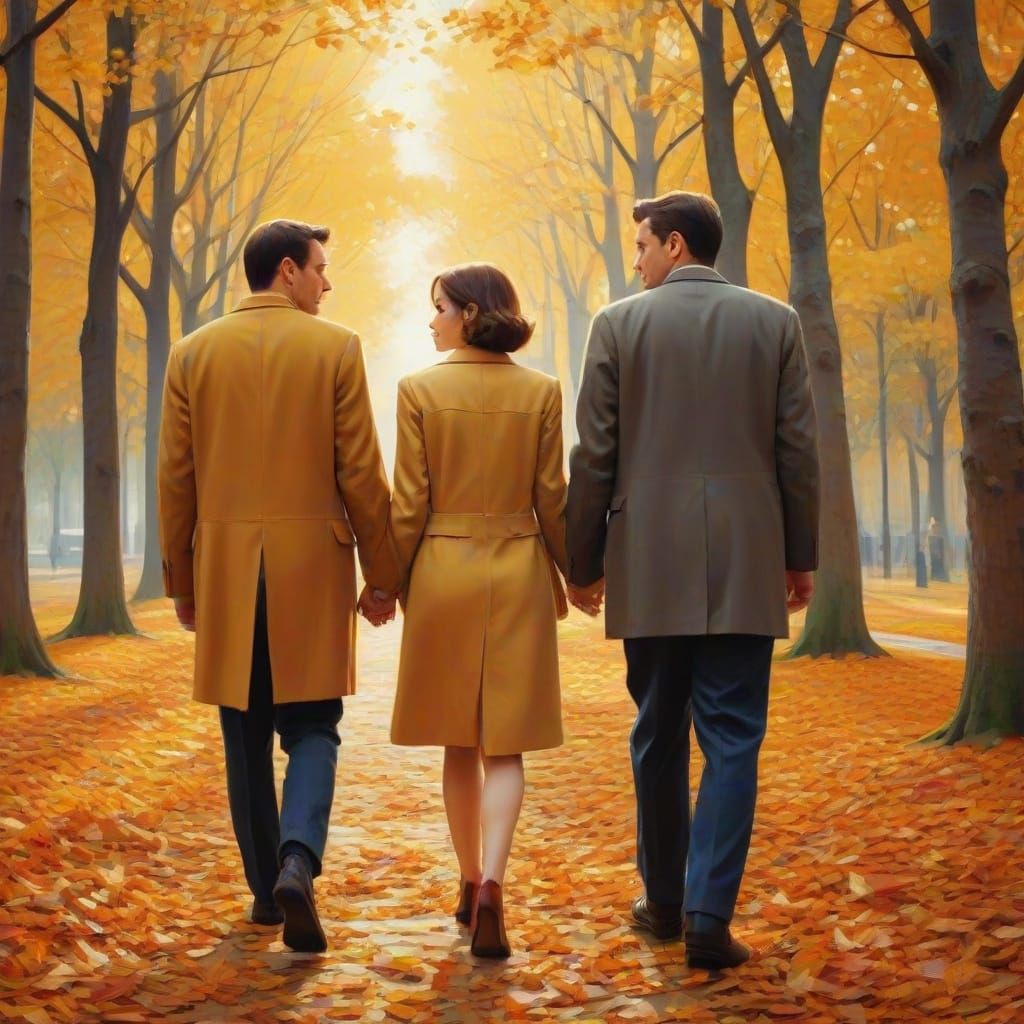 This image shows a couple walking through a park in autumn. The scene is rendered in a cubist style, reminiscent of early 20th-century abstract art, with warm colors and soft brushstrokes.