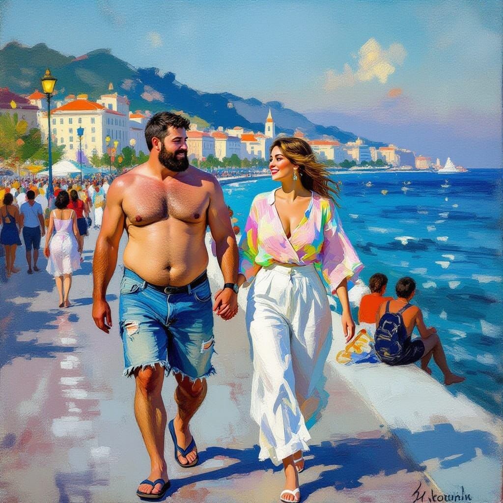 This image captures a carefree couple strolling along the vibrant Sochi embankment on a warm summer evening, surrounded by a lively crowd and the sparkling Black Sea, in a style reminiscent of impressionist artists with bold brushstrokes and vivid colors.