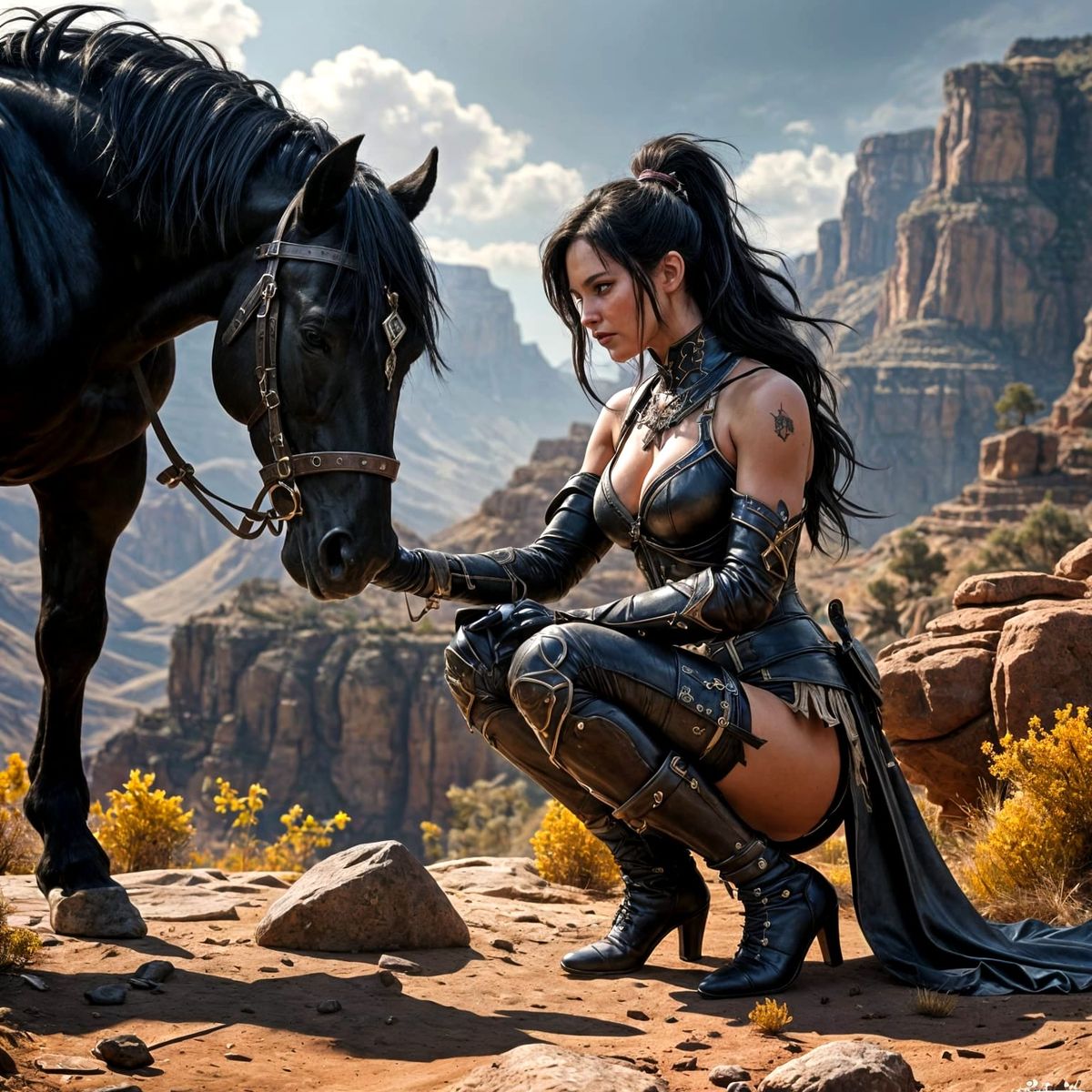 This image shows a female warrior in a medieval costume, squatting and petting a black stallion in the Grand Canyon. The artwork features a dark, epic fantasy aesthetic.