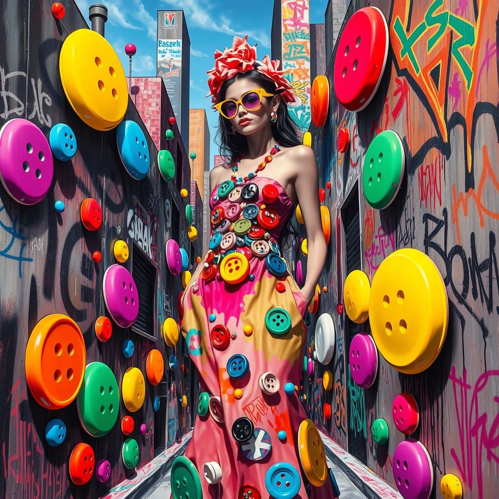 This image showcases a haute couture fashion model amidst a surreal cityscape, surrounded by oversized neon buttons that blend with graffiti-covered walls, rendered in a vibrant mix of mediums with bold brushstrokes and high-contrast colors, evoking 1980s pop art street art.