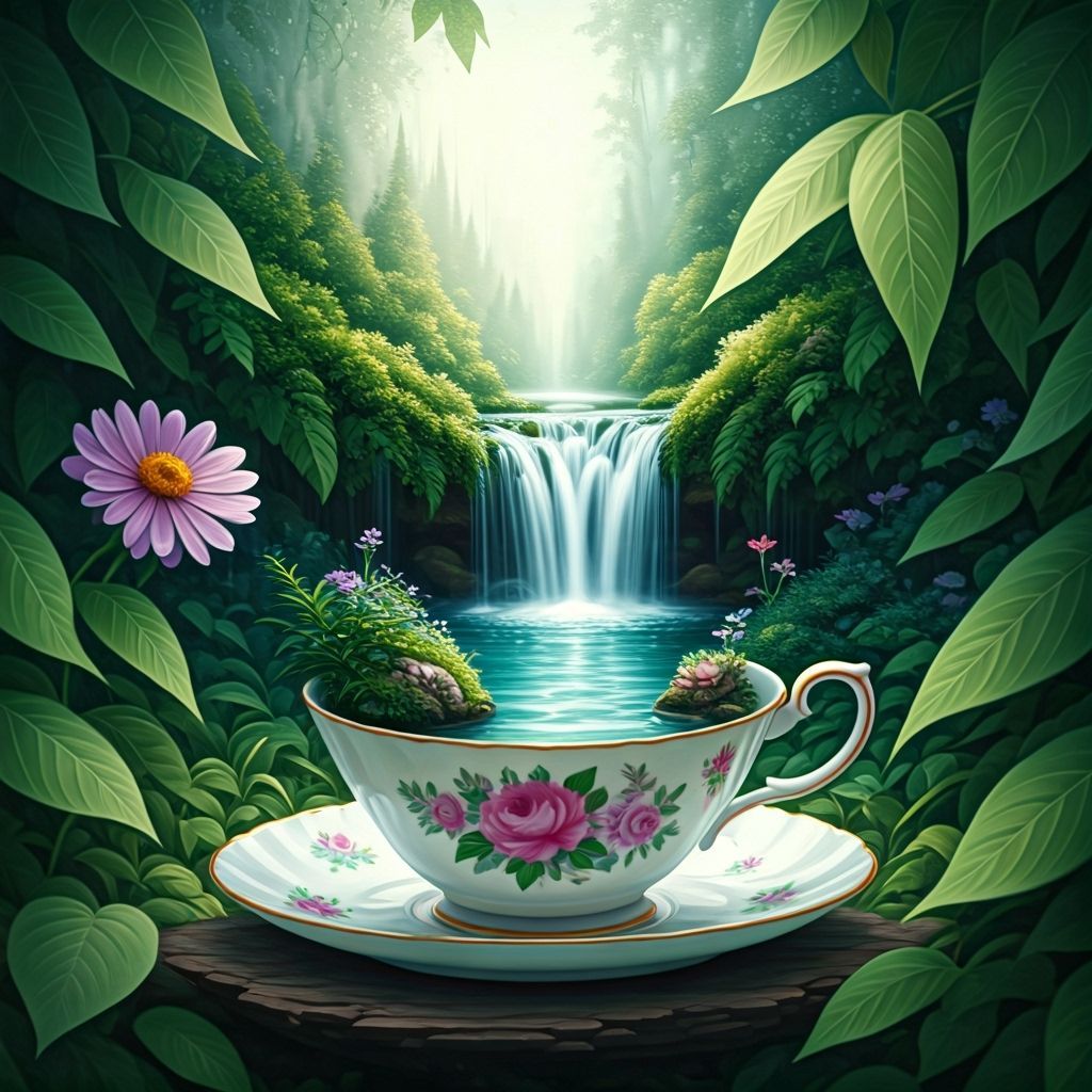A serene image of a waterfall flowing into a teacup, enveloped by greenery. The scene evokes a painterly aesthetic with soft, warm lighting and intricate details, reminiscent of classic fantasy art.