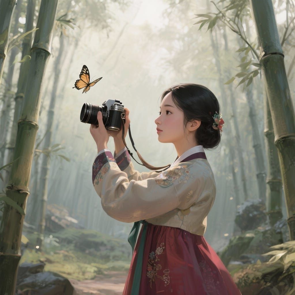This image features a woman in traditional Korean attire holding an antique camera, photographing a butterfly in a tranquil bamboo grove. It has a soft, painterly illustration style with diffused lighting.