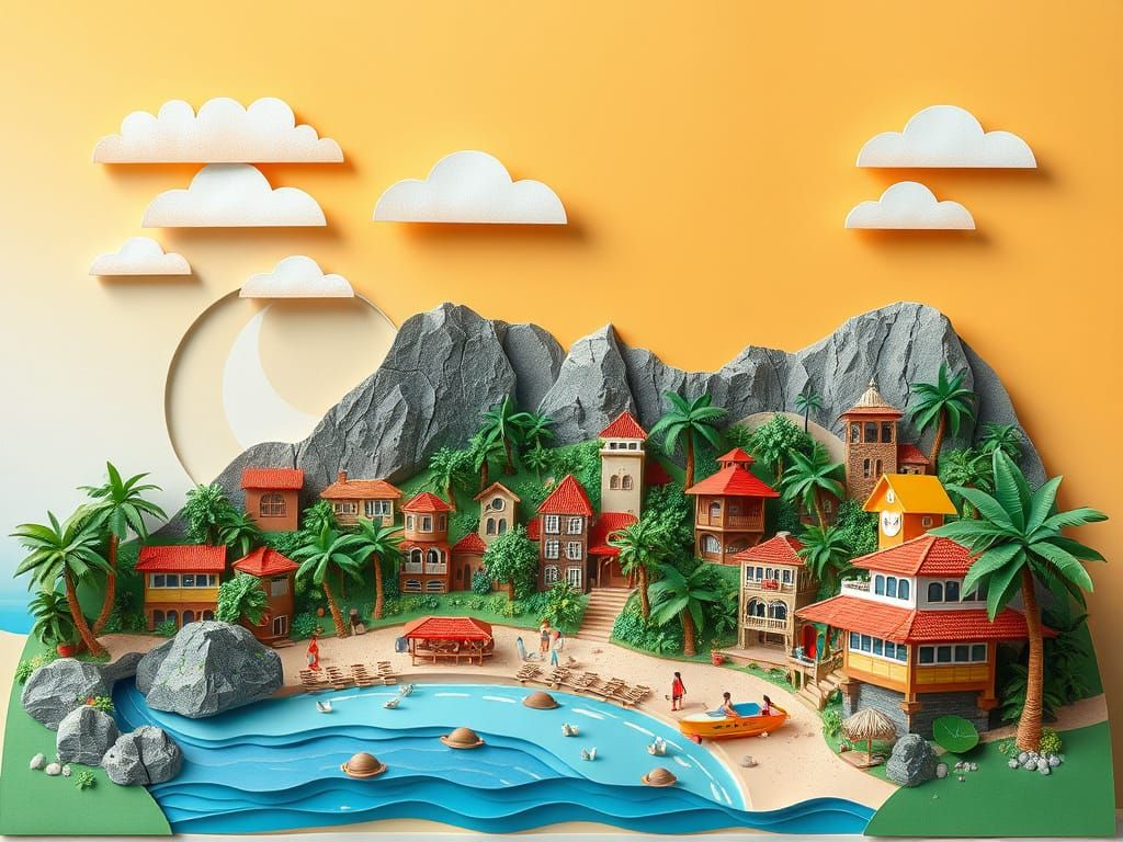 This image shows a vibrant tropical village scene crafted from colorful paper in a 3D collage style. The wide-angle shot captures a beachside village with palm trees.