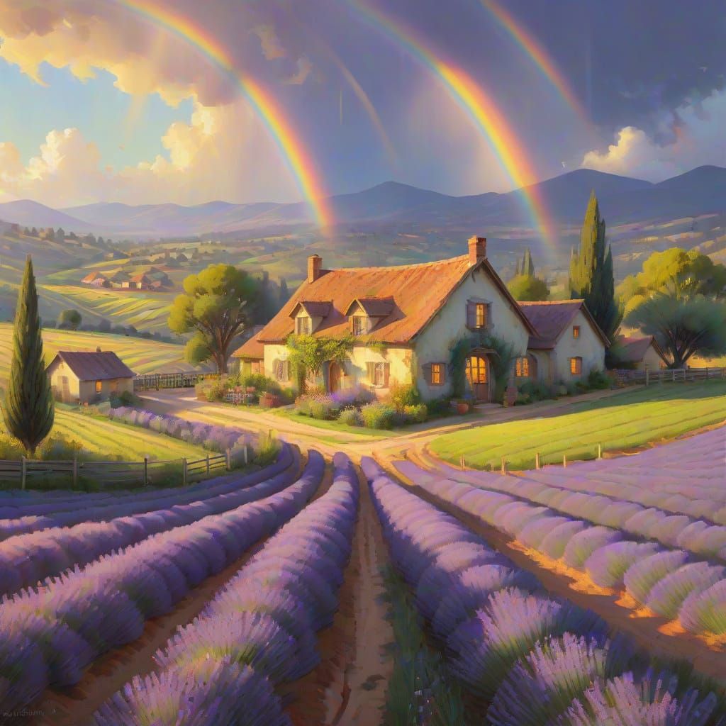 This serene landscape painting depicts a dreamy atmosphere with a double rainbow arcing over a lush lavender farm, a quaint cottage nestled amidst the fragrant blooms, captured in warm, rich Impressionist brushstrokes.