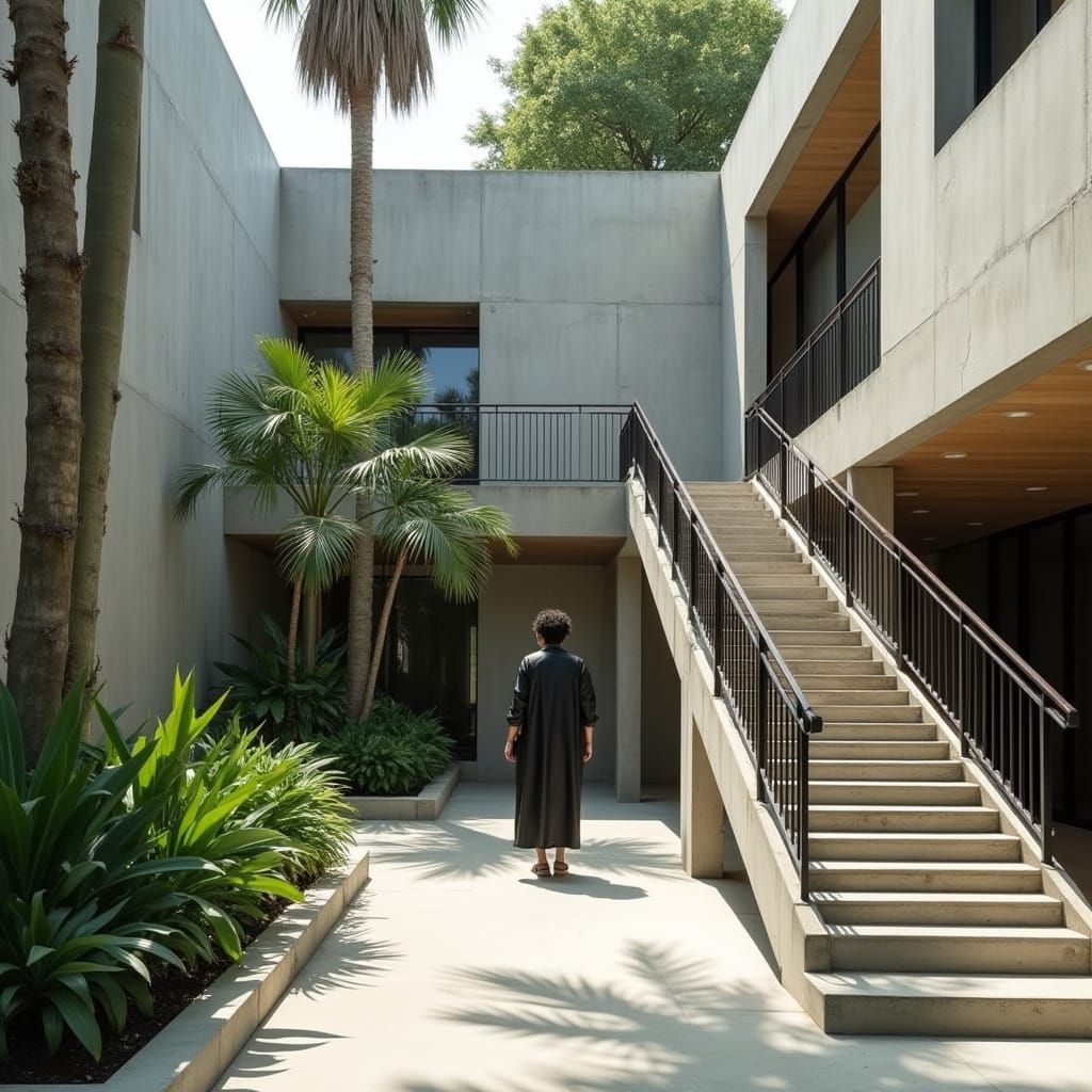 This serene image captures a woman standing amidst a tranquil concrete courtyard, surrounded by lush greenery and mature palm trees, with a muted color palette and cinematic lighting that emphasizes the interplay of light and shadow.