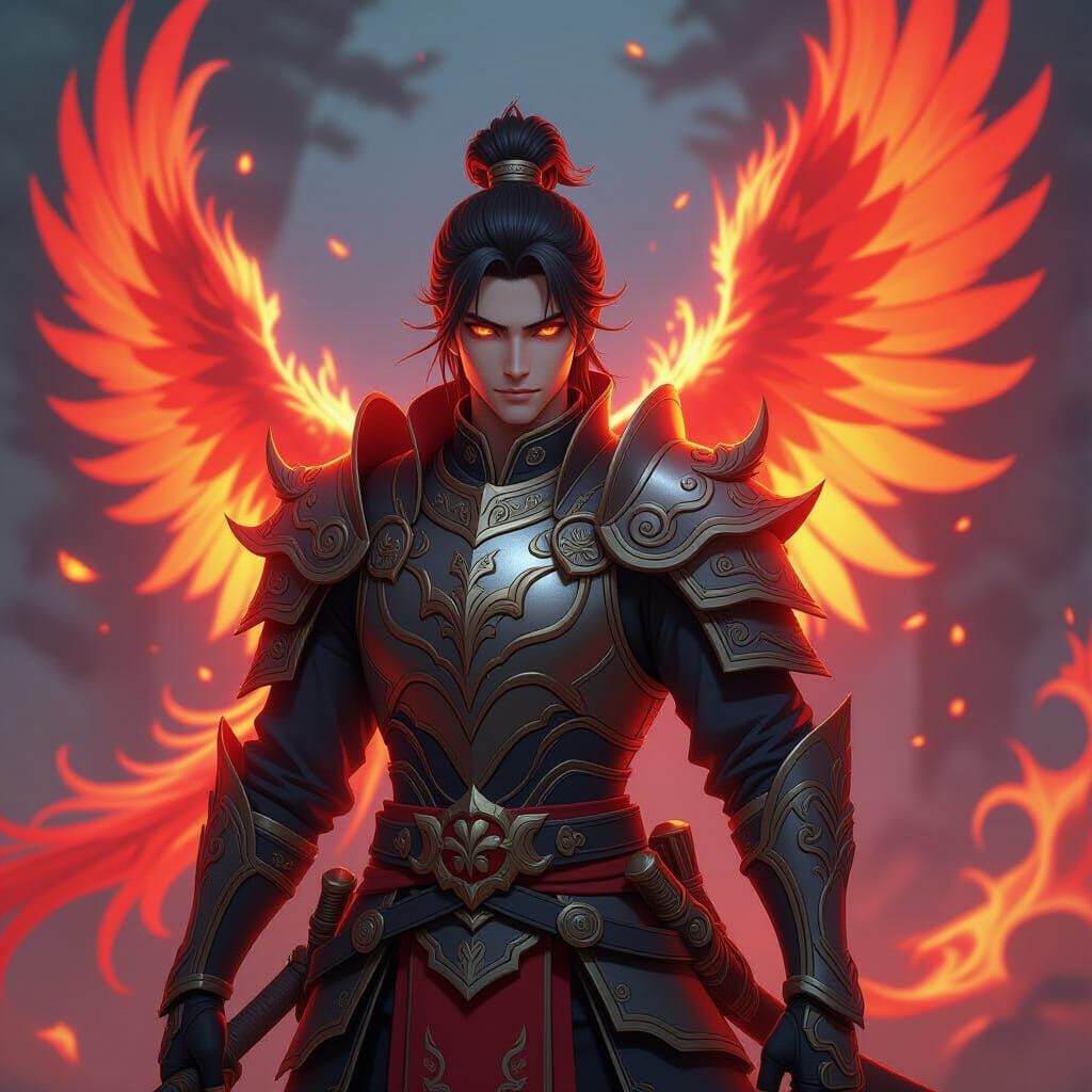 A 3D anime-style depiction of a phoenix clan's crown prince in fiery armor, radiating charm and pride amidst ethereal flames. The character design blends Pixiv's vibrant colors with a stylized aesthetic.