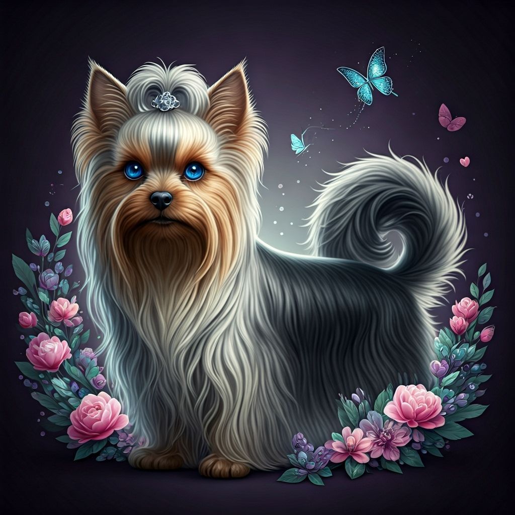 A digital painting shows a majestic Yorkshire Terrier with sapphire eyes, surrounded by glowing flowers and butterflies. The artwork features gem-studded accents and an ethereal, muted color palette.