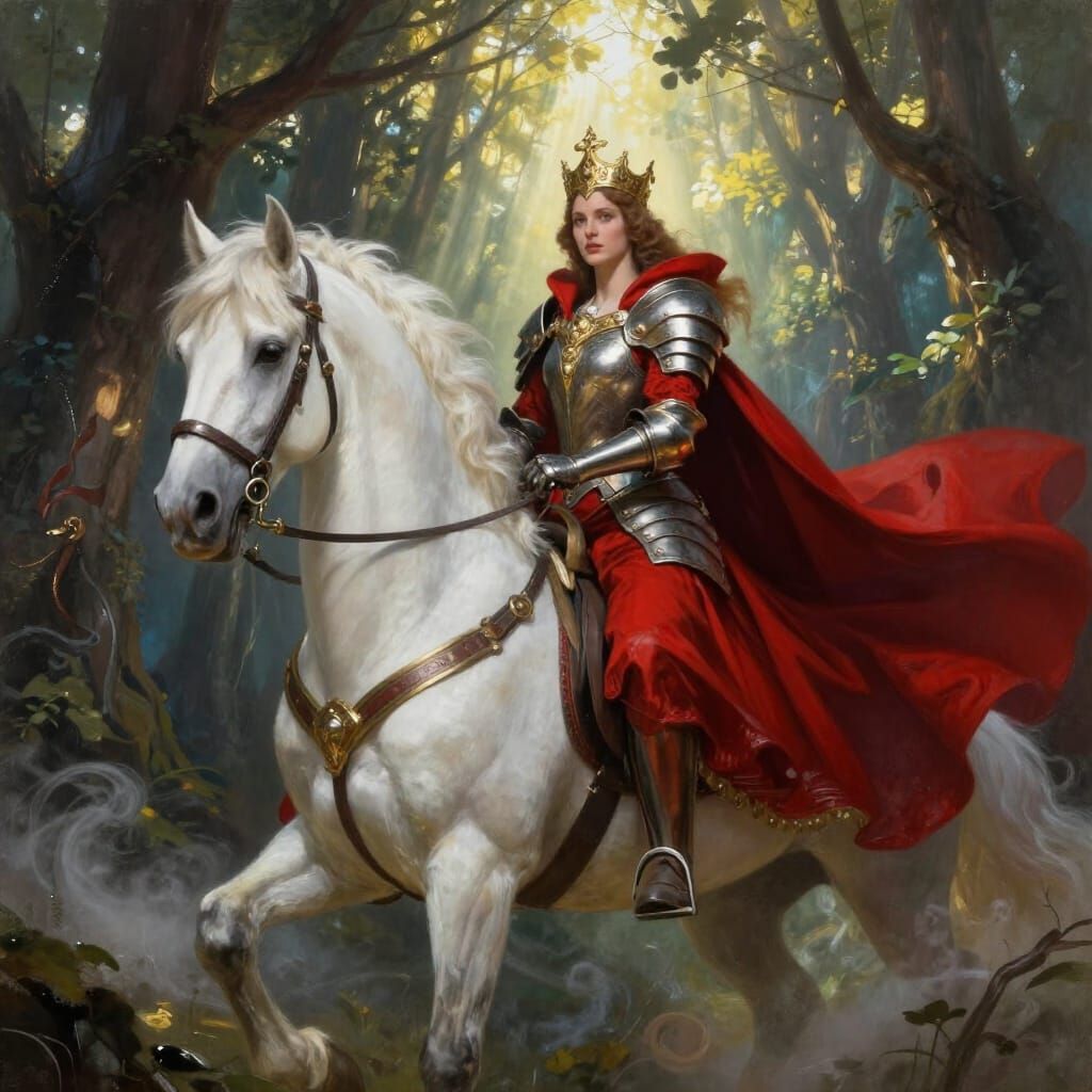 Generate stunning images of queens in armor, riding horses through medieval forests. Free and easy to use!
