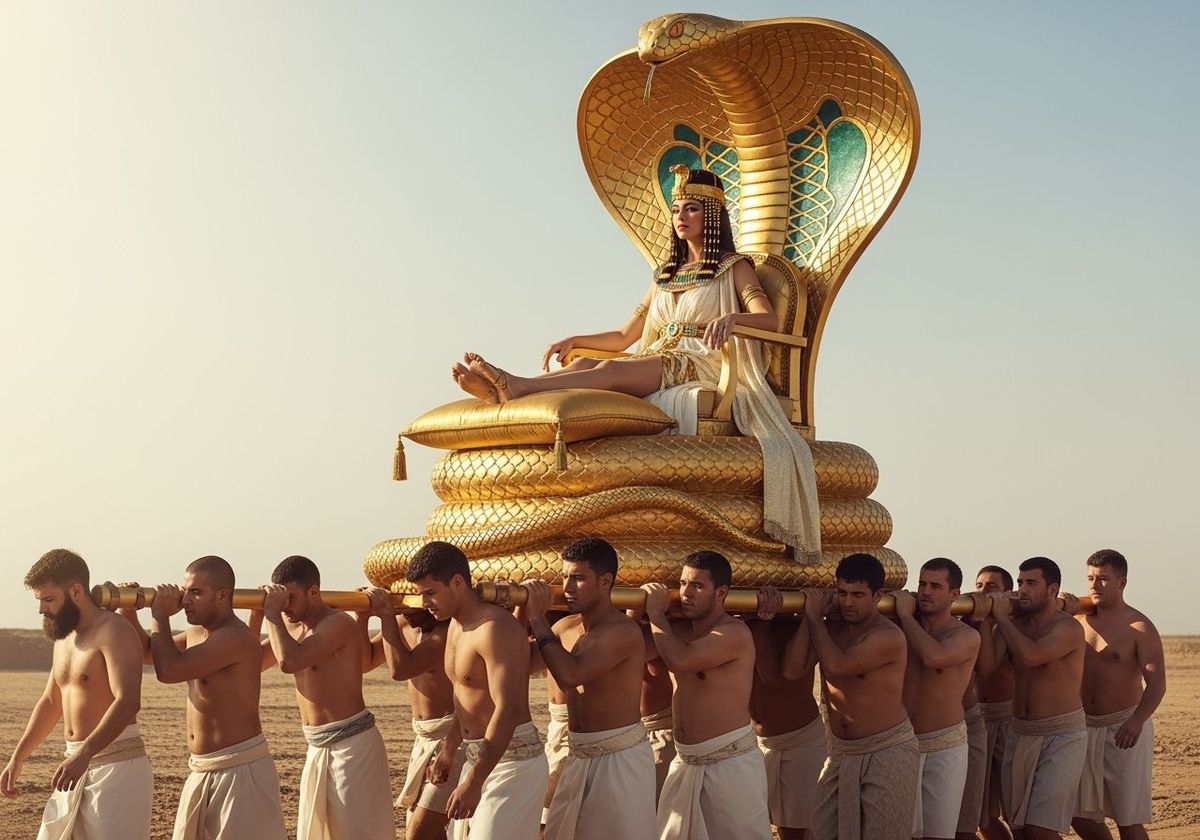 This image shows an Egyptian queen being carried on an elaborate cobra throne by many servants. The scene is lit with warm, natural light and composed as a high-resolution, shallow depth-of-field photograph.