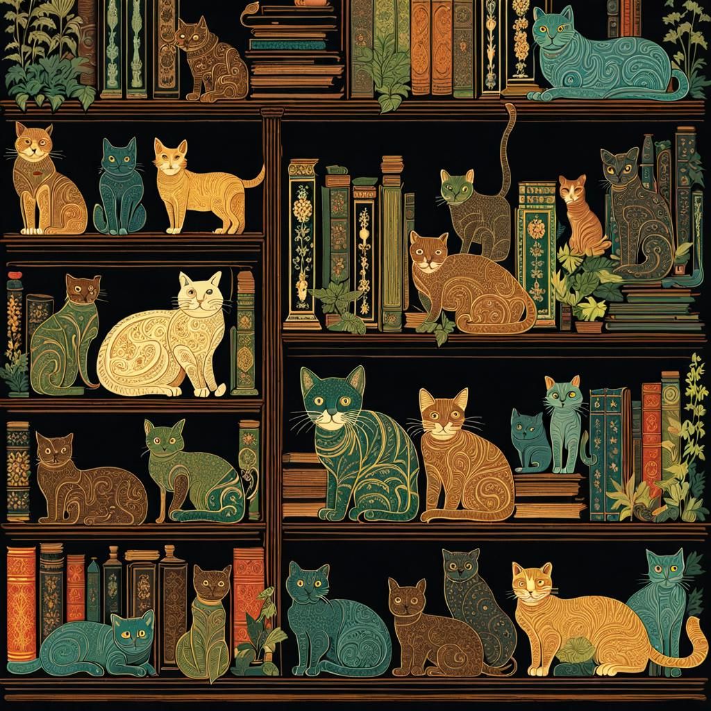 This image shows an antique bookshop filled with cute cats peering from the shelves. The illustration is intricately detailed with rays of light and ivy plants in a whimsical style.