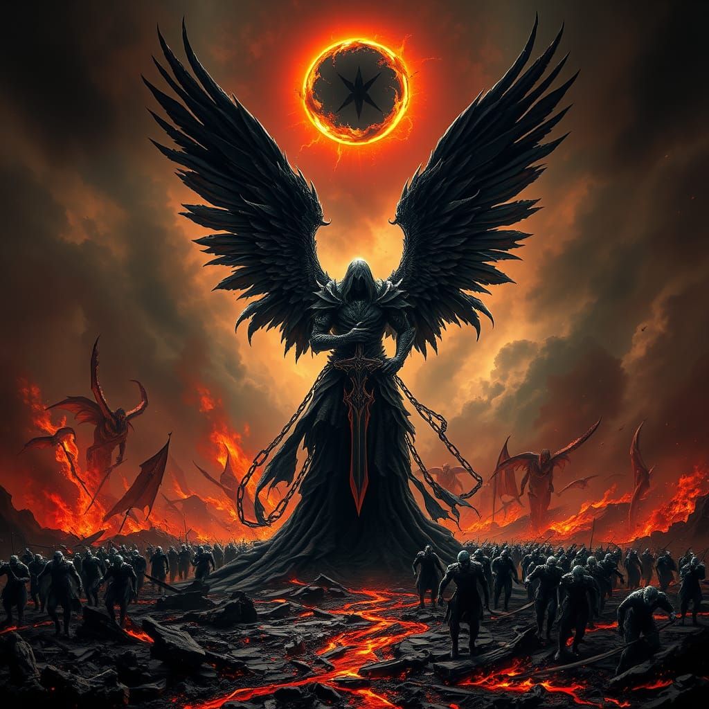 This image shows a fallen angel in dark armor standing on a battlefield. Tattered wings stretch behind the figure, and rivers of lava flow in the cracked earth. The scene is rendered in deep, rich colors.