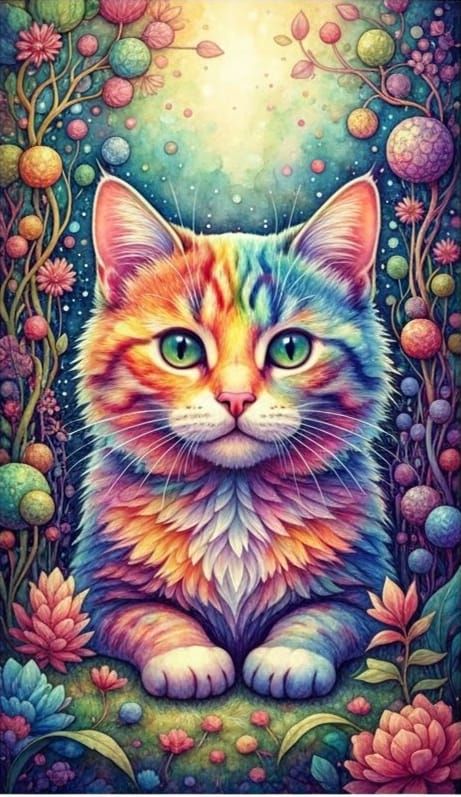 This image shows a vividly colored cat in a dreamy, patchwork watercolor. The artwork is highly detailed with a mix of impressionism and hyperrealism, depicting the cat amid fantastic flora and fauna.