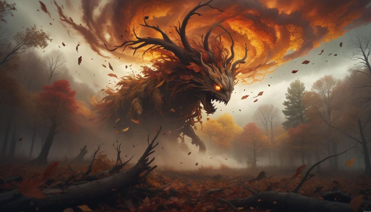 This image shows a swirling tornado creature composed of colorful autumn leaves and dark clouds. A devastated forest is visible, with trees being destroyed by the powerful winds in a dramatic digital painting.