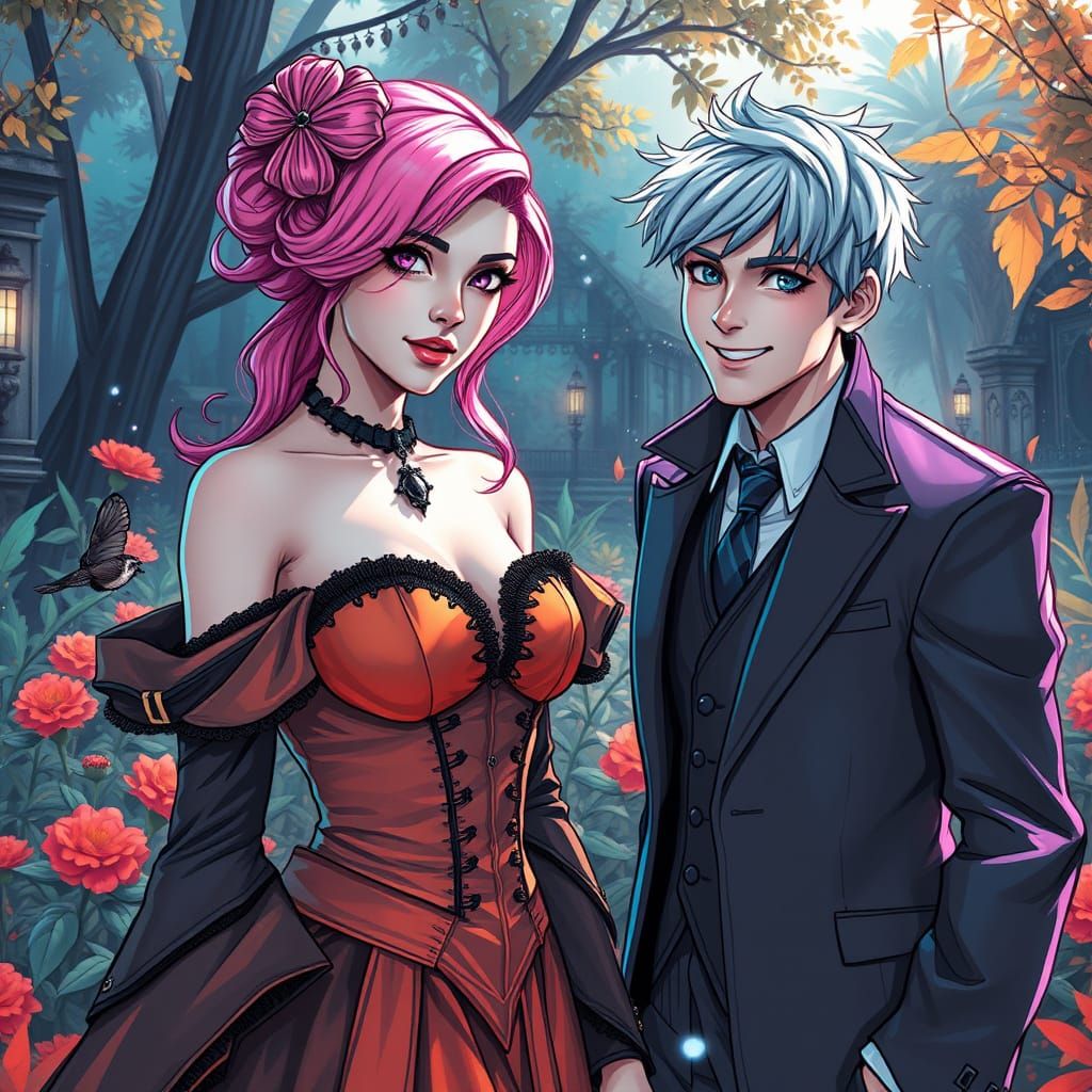 This striking black and white line art depicts a charming couple in a whimsical garden setting, featuring intricate details and vibrant triadic colors, reminiscent of the works of Alphonse Mucha