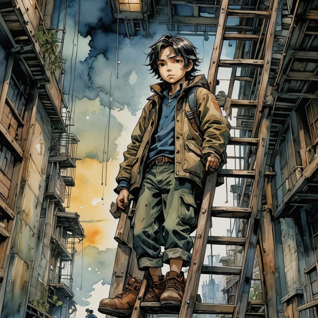 This image shows a person walking under a ladder at dawn. The artwork is rendered as a highly detailed watercolor and alcohol ink comic illustration.
