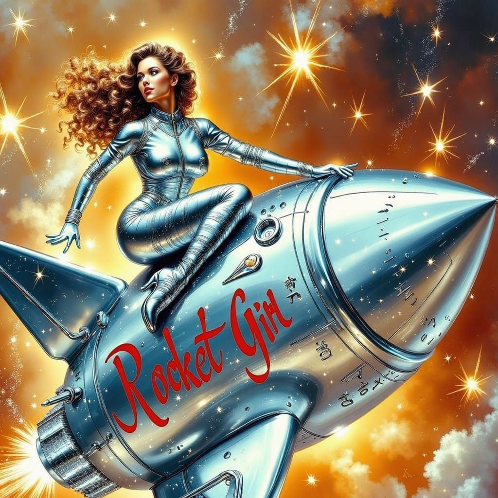 "<lora:Exquisite Flux:1.0> s 50's pinup girl with brown hair in a fitted spacesuit and heels, straddling a retro-futuristic rocket ship, viewed from the side, with "Rocket Girl" emblazoned in red cursive script on the rocket's metallic surface, illustrated in a vintage style with bold lines, vibrant colors, and a nostalgic flair."