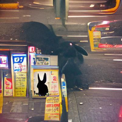 This image shows a black rabbit in a neon-lit Tokyo street. The rabbit stands out against the vibrant cityscape in a cyberpunk aesthetic.