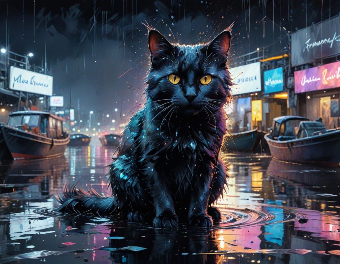 This image shows a neon-lit harbor at night during a monsoon, with junk boats and holographic billboards. The artwork combines watercolor techniques with cinematic stylization to create a mesmerizing scene.