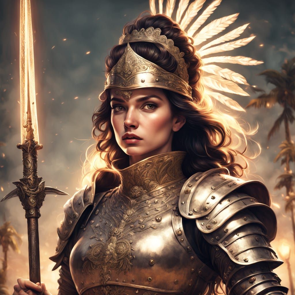 A highly detailed digital painting of a female conquistador in ornate armor, holding a spear. Captured in a realistic, cinematic film still style with vintage lighting.